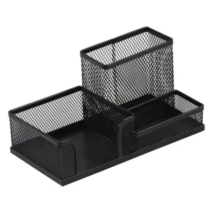 Suport plasa metalica accesorii birou, 3 compartimente - negru